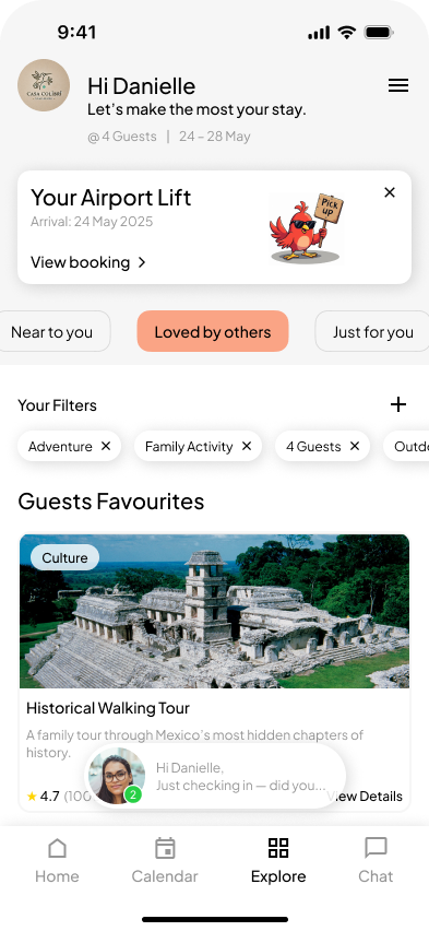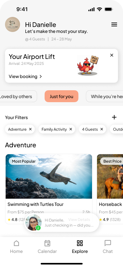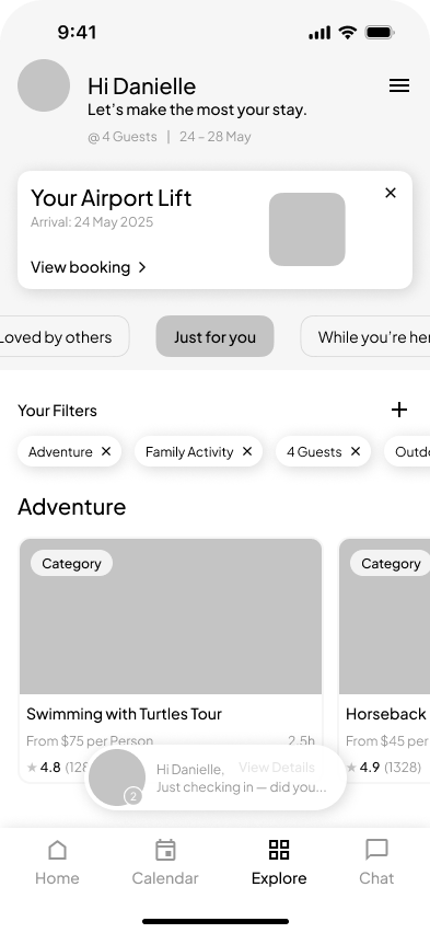 We introduced a conversational chatbot into the guest onboarding flow, simulating a concierge-style interaction to personalize the experience from the start. This approach allowed us to tailor recommendations based on guest interests, creating a more engaging and human-centered journey.