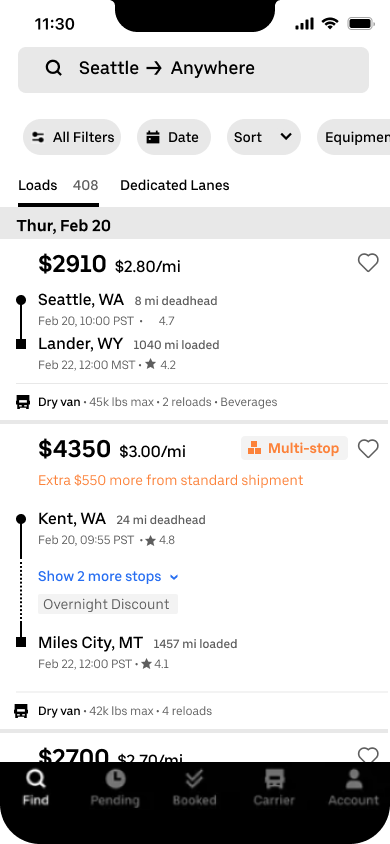 Independent truck drivers use the Uber Freight app to efficiently filter and book loads based on route length, stop count, and payout.