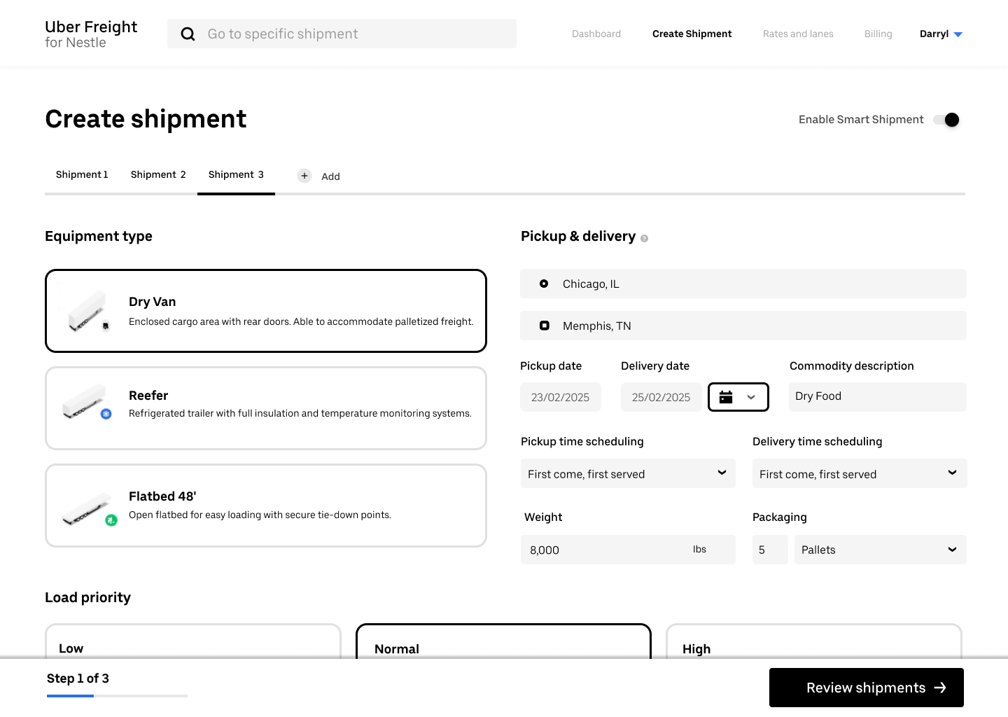 the new Multi-Drop Delivery flow guides users to add multiple drop-off locations within one truckload, maximizing capacity and reducing overall shipping costs.
